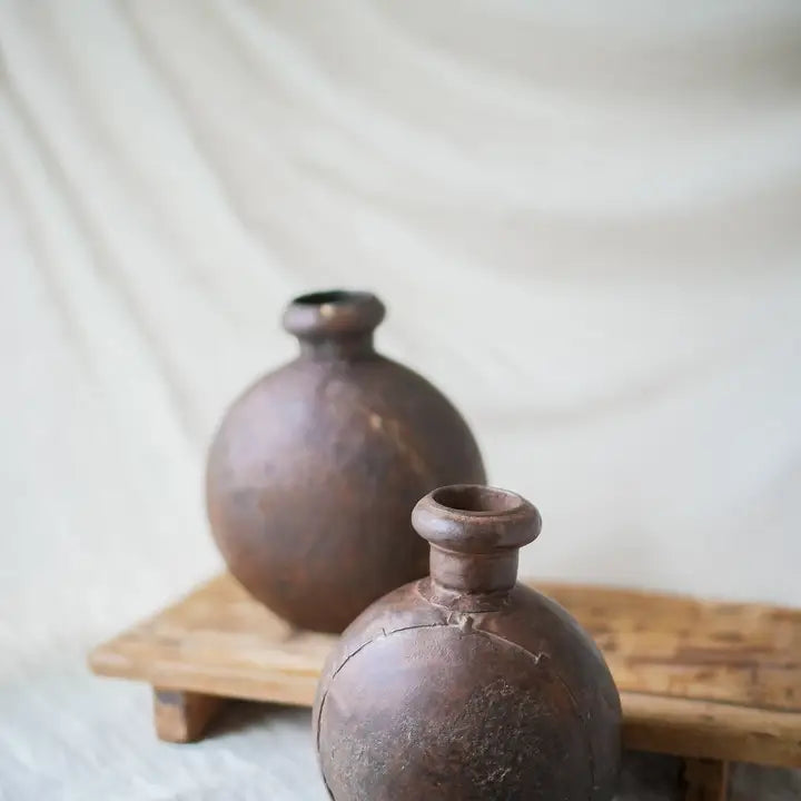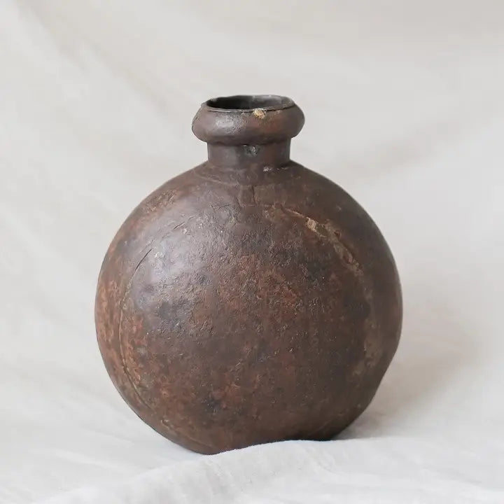 Regular price $99.50This vintage iron pot originates from the desert villages of India, where it was once used to store oil and later became a trusted companion for villagers traveling across the harsh desert landscape. Its design allowed water inside to cool naturally in the dry desert air, offering refreshment during long journeys. Crafted from durable iron, the pot was passed down through generations, valued for its strength and practicality. Today, it serves as a unique and charming accent piece, perfect as a vase for flowers or a decorative element, bringing both rustic beauty and a piece of history into any space.