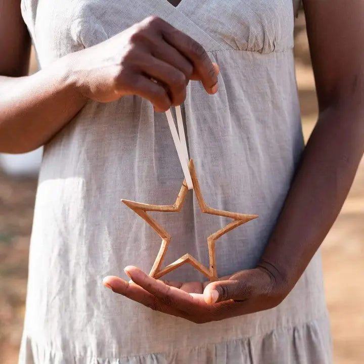 Regular price $25.00These beautiful hand-carved and fair-trade star ornaments are crafted out of wood. This star shaped ornament can be hung from its ribbon as a Christmas tree decoration, or as an inside door or window decoration. You can even create a festive table setting by removing the ribbon and placing them around your table. They make great gifts as each star is packaged individually in a beautiful box. Wood carving is a traditional handcraft in the Congo, a skill that is passed down through generations.